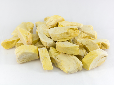Mô tả đặc trưng: Sầu riêng là loại trái cây khó sấy, dễ bị ảnh hưởng đến cấu trúc, hình dạng cũng như giá trị dinh dưỡng bên trong nếu như lựa chọn phương pháp sấy không phù hợp. Do đặc điểm thịt sầu riêng dễ nhũn, nát, thành phần bên trong chứa chất béo, tỉ lệ đường cao nên sầu riêng không thể sấy trong nhiệt độ cao, mà phải sấy trong điều kiện nhiệt độ, áp suất thấp nên sầu riêng sấy thăng hoa mới có thể đảm bảo thời hạn sử dụng lâu dài nhất. Công nghệ sấy thăng hoa sầu riêng giúp những múi sầu riêng chín mọng giữ nguyên được giá trị dinh dưỡng, màu vàng tươi tự nhiên cùng hương vị thơm ngon, béo ngậy đặc trưng. Thời hạn bảo quản của sầu riêng cũng được lâu dài hơn.